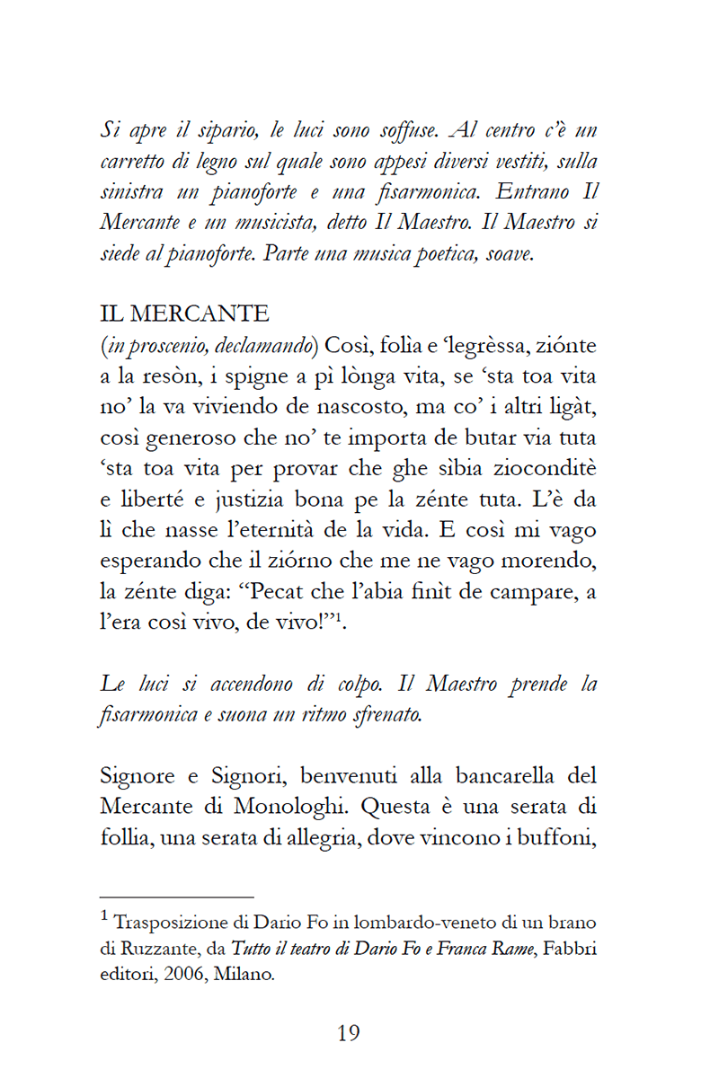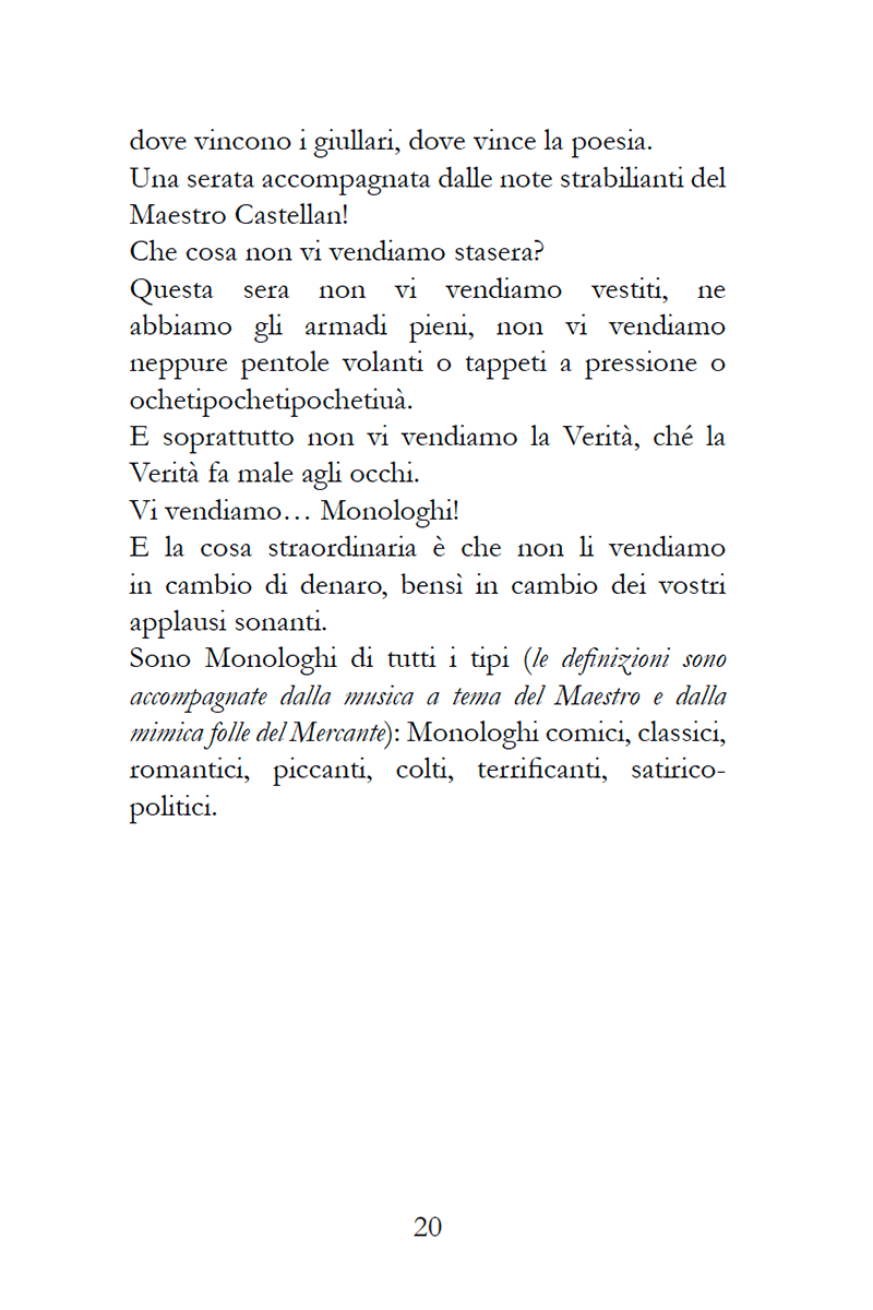 Che cosa non vi vendiamo stasera? Questa sera non vi vendiamo vestiti, ne abbiamo gli armadi pieni, non vi vendiamo neppure pentole volanti o tappeti a pressione o ochetipochetipochetiuà. E soprattutto non vi vendiamo la Verità, ché la Verità fa male agli occhi. Vi vendiamo… Monologhi!
