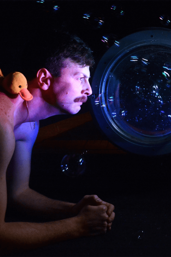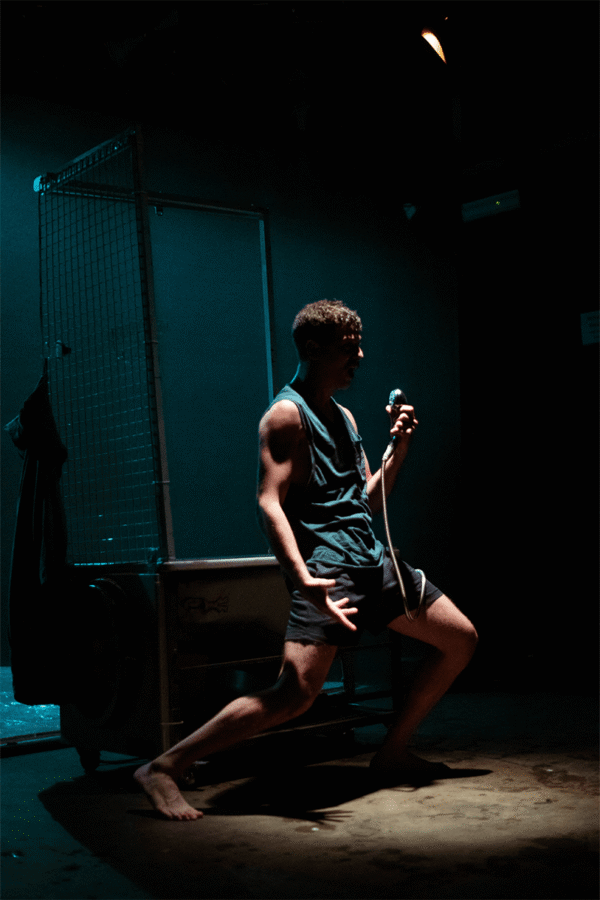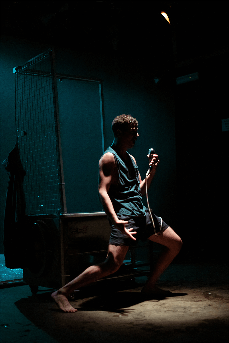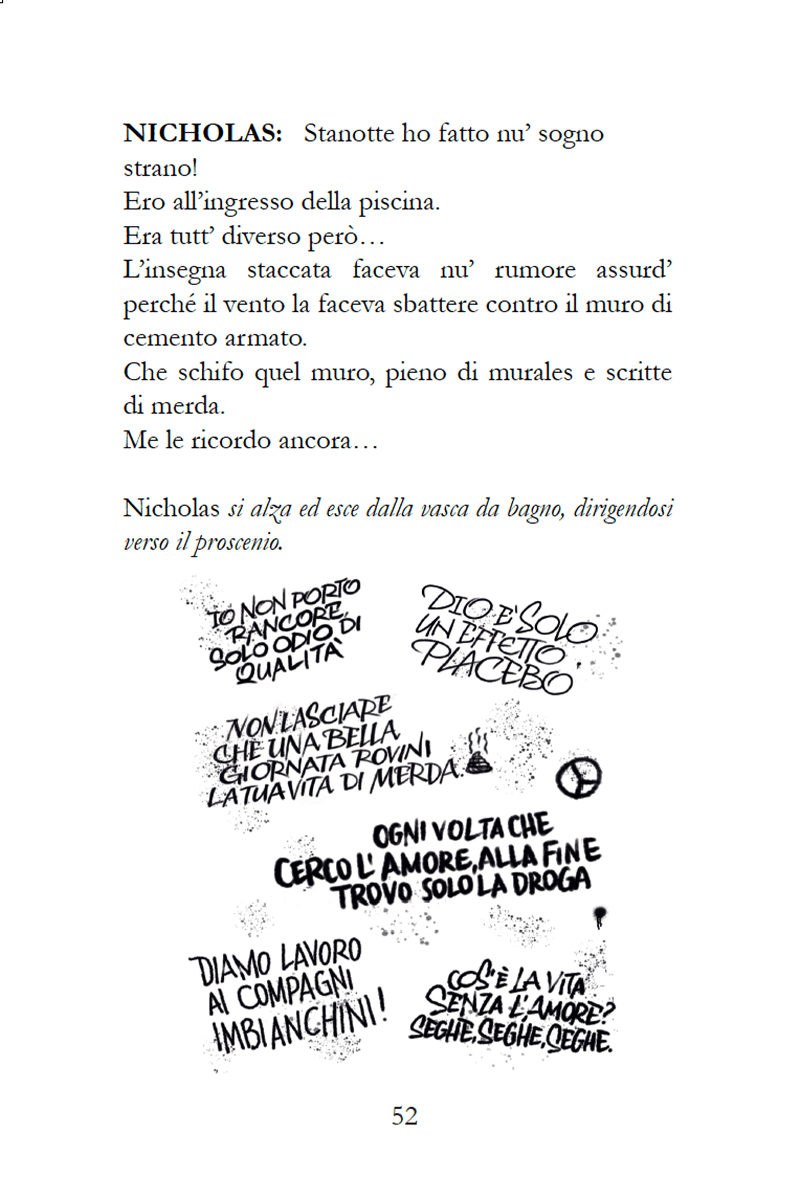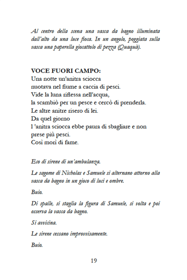 Affogo per realizzare ora qualcosa. L’uomo abbandonato a se stesso, è troppo cattivo per essere libero, così dice Nicolas, il protagonista della storia che sogna d’essere un giorno un nuotatore professionista. Il testo teatrale di Dino Lopardo c’ha un ritmo incalzante e vario: passa dai toni fiabeschi, ai racconti quotidiani aspri delle vacanze, della piscina comunale, di fratellanza, di parenti grotteschi.