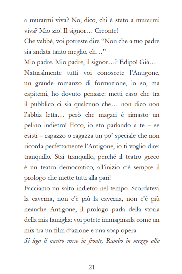 “Per assistere a una tragedia greca è necessaria una certa predisposizione d’animo. Nello specifico: una tendenza alla depressione, una generale mancanza di speranza e del pessimismo cosmico. A me, ve l’assicuro, queste cose vengono naturali, ma a voi? Magari voi siete delle persone felici… Ecco, dovete smettere di esserlo.”