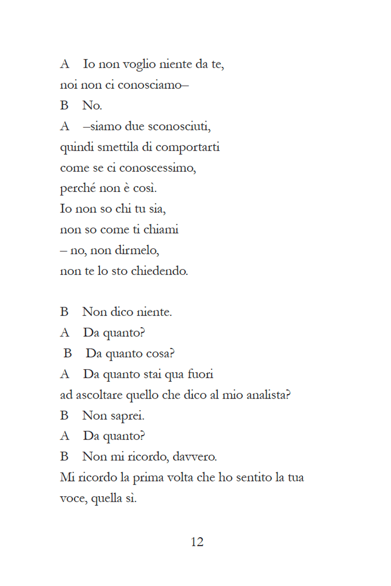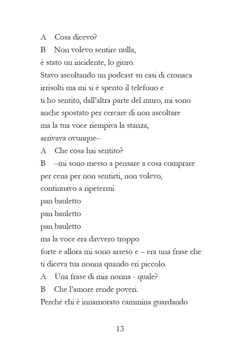 Persi e disorientati A e B sono i protagonisti di questa disillusa commedia romantica. Sono storti, fuori asse, sbilanciati, non tanto perché personaggi di una commedia e quindi spostati verso un certo tipo di forma, piuttosto perché tutto ciò che è vivo oscilla, rimane in bilico e l’equilibrio lo cerca. Ecco, nessun equilibrio. Mai. Sempre spostati, incespicanti. Che si interrompono, che tremano, che non esitano e si buttano senza sapere dove finiranno. Divertenti e spietati, A e B giocano ad amarsi, alternado dolore e dolcezza.